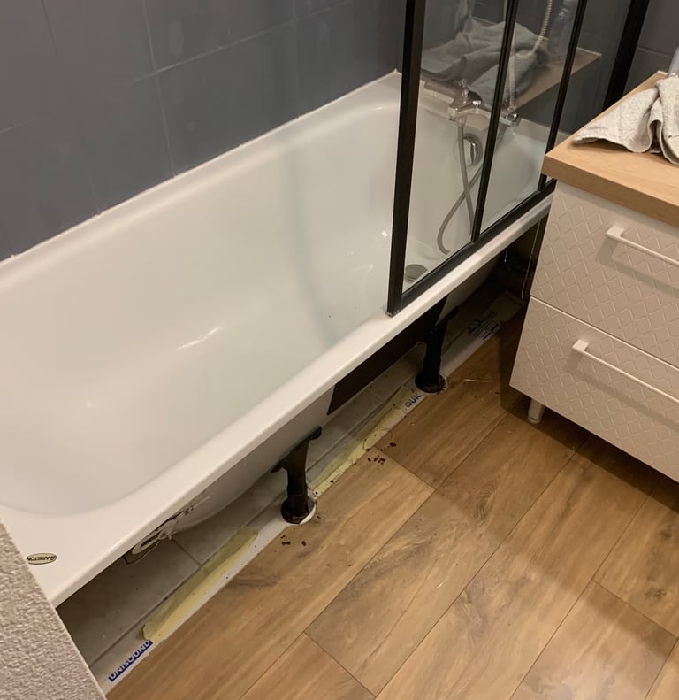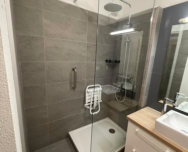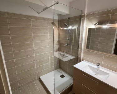 Dépose de l'ancienne baignoire, création d'une douche à l'italienne moderne et pose de faïence grand format.