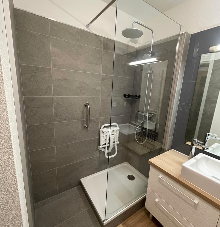 Installation d'un receveur extra-plat avec paroi en verre, pose d'un siège rabattable et d'une barre de maintien.